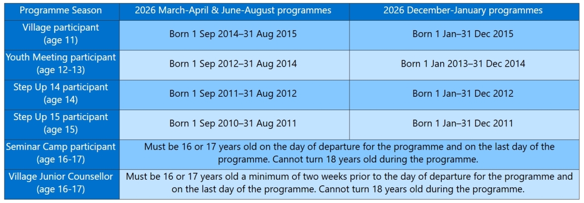 | Es gelten international einheitliche Altersvorgaben für die verschiedenen Programme; eine Übersicht über die aktuell geltenden Regelungen findet ihr im folgenden Schaubild. Ausnahmen von diesen Regelungen sind leider nicht möglich! Danke für euer Verständnis! |