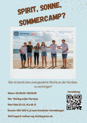Termin: 02.08. - 09.08.2026 Kosten: max. € 520,00, bei voller Auslastung € 450,00, jeweils zzgl. Reisekosten Ort: Tönning an der Nordsee Altersgruppe: 10 - 13-Jährige Anmeldeschluss ist der 15.03.2026 Das nationale Camp ist eine Initiative der Workinggroup Hosting und richtet sich an Mitglieder aller deutschen CISV Chapter. Nette Menschen, viel Spaß und ganz viel CISV Spirit sind garantiert! Teilnehmen können max. 24 Kinder der Altersgruppe 10-13 Jahre und zwei JCs im Alter von 16 / 17 Jahren. Bei den nationalen Camps halten wir bzgl. des Alters an der Jahrgangsregelung fest, mit der Ausnahme, dass das Mindestalter von 10 Jahren vor Campbeginn erreicht sein muss. An- und Abreise müssen eigenständig organisiert werden (wir unterstützen bei der Bildung von Fahrgemeinschaften oder der Koordination von Gruppen-Bahnfahrten). Ab Hamburg wird eine Weiter-Begleitung nach Tönning mit Hamburger Familien organisiert. Anmelden könnt ihr eure Kinder über folgenden ANMELDELINK Die Teilnahme an einem Internationalen CISV - Programm ist kein Ausschlusskriterium, eine Teilnahme an beiden Programmen wäre grundsätzlich möglich (in Abhängigkeit von den verfügbaren Plätzen). Fragen zum Camp beantwortet die Workinggroup Hosting unter wg.hosting@cisv.de |