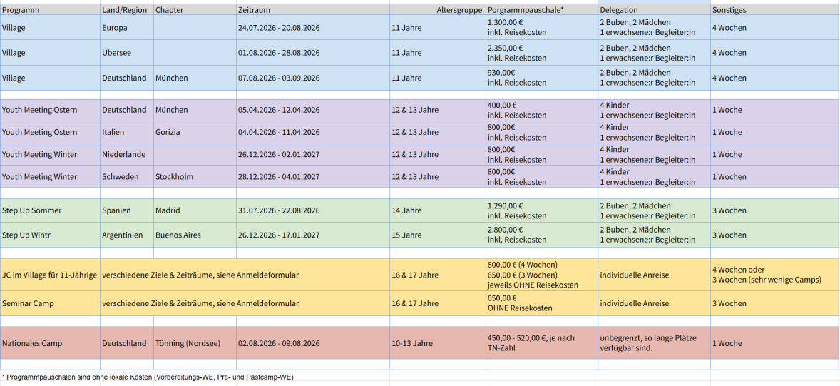 *Die oben aufgeführten Programmpauschalen beinhalten: Village: Teilnahmepauschale Village inkl. Reisekosten nicht enthalten: Kosten für Kennelernwochenende, Pre- und Pastcampwochenende bitte beachten Sie für evtl. weitere Kosten die Auflistung in den Anmeldeformularen! Youth Meeting Ostern: Teilnahmepauschale Village inkl. Reisekosten nicht enthalten: Kosten für Kennelernwochenende, Pre- und Pastcampwochenende bitte beachten Sie für evtl. weitere Kosten die Auflistung in den Anmeldeformularen! Youth Meeting Sommer: Teilnahmepauschale Youth Meeting inkl. Reisekosten Ausnahme: Youth Meeting Japan, Teilnahmepauschale ist exkl. Reisekosten nicht enthalten: Kosten für Kennenlernwochenende, Pre- und Pastcampwochenende bitte beachten Sie für weitere Kosten die Auflistung in den Anmeldeformularen! Step Up: Teilnahmepauschale Step Up inkl. Reisekosten nicht enthalten: Kosten für Kennenlernwochenende, Pre- und Pastcampwochenende, Regioschulung bitte beachten Sie für weitere Kosten die Auflistung in den Anmeldeformularen Junior Councellor (JC): Teilnahmepauschale JC OHNE Reisekosten nicht enthalten: Kosten für Kennenlernwochenende, Pre- und Pastcampwochenende, Reisekosten ins Camp, bitte beachten Sie für weitere Kosten die Auflistung in den Anmeldeformularen Seminar Camp: Teilnahmepauschale Seminar Camp: OHNE Reisekosten nicht enthalten: Kosten für Kennenlernwochenende, Pre- und Pastcampwochenende, Reisekosten ins Camp, Reisekosten zur Seminar Camp Schulung in Hamburg, bitte beachten Sie für weitere Kosten die Auflistung in den Anmeldeformularen Irrtum vorbehalten! |