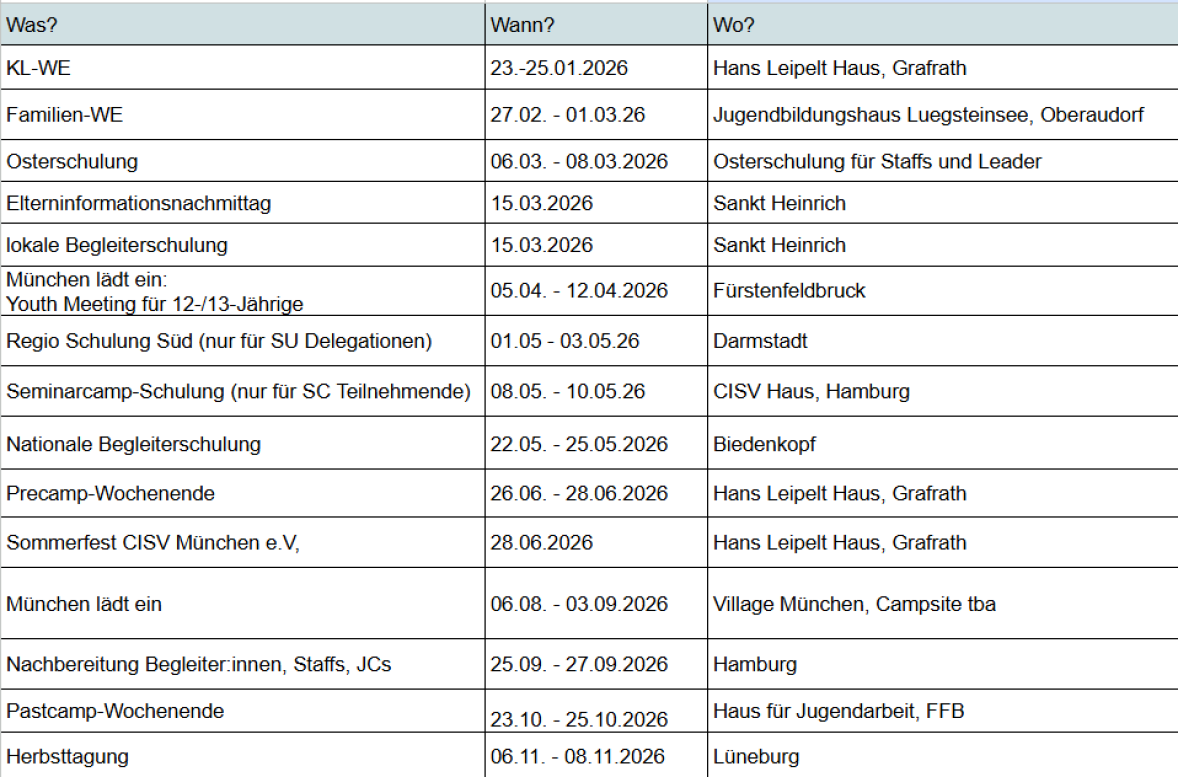 wir hoffen, ihr seid alle gut ins neue Jahr gekommen, und habt den letzten freien (Ferien)tag in vollen Zügen genossen. Unsere Winter Youth Meeting Delegation ist nach einer Woche im hohen Norden wieder gut in München gelandet - von der Kälte in die Kälte; anders sieht es bei unserer Step Up Delegation in Thailand und unserer JC Leonie in Brasilien aus: alle dürfen noch eine Weile das warme Wetter sowie das legendäre CISV Camp-Feeling genießen - die Glücklichen! Wir hoffen, auch viele andere Teilnehmende im Jahr 2026 mit unseren Programmen glücklich zu machen. Angebote haben wir viele, im In- und Ausland, und immer international - mit Ausnahme des nationalen Camps! Über unten stehenden Link könnt ihr eure Kinder zu den Programmen 2026 bis Donnerstag, 15.01.2026 anmelden. Im Anmeldeformular findet ihr folgende Angebote: Nationales Camp für 10- 13-Jährige | Village für 11-Jährige | JC im Village für 16-/17-Jährige | Youth Meeting für 12-/13-Jährige | Step Up für 14-/15-Jährige | Seminar Camp für 6-/17-Jährige